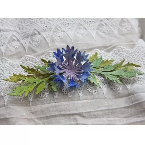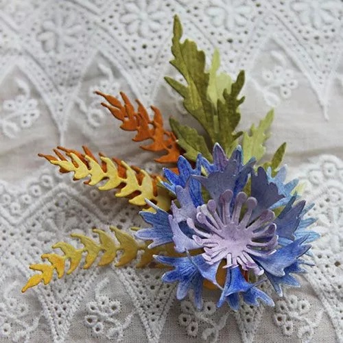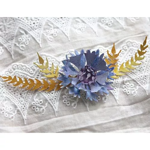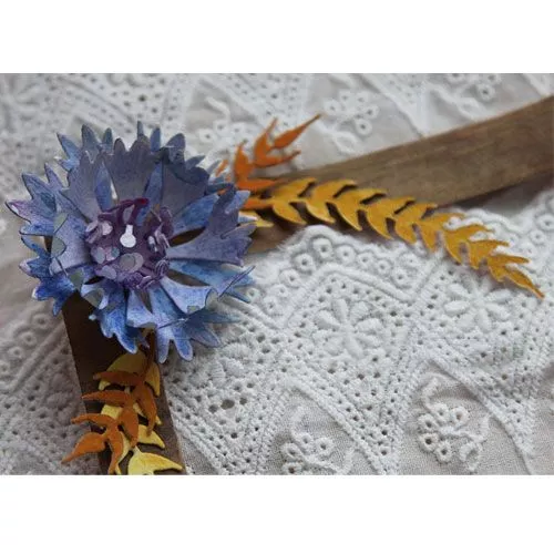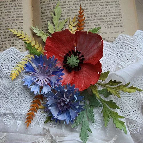 В наборе 8 ножей, размер маковых лепестков 5х8,5 см, васильковых - 5 см, большого макового листа - 4х7 см, маленького - 1х4 см, большого колоска - 1,5х7 см, маленького - 1,5х3,5 см, тычинок - 3 см, маковой коробочки - 1,5 см. Линии на лепестках - это прожилки (тиснение). В середине каждого цветка есть небольшая дырочка для тычинок или брадса. Для создания мака нужно вырубить две детали лепестков, две детали тычинок и одну коробочку. Чтобы приподнять коробочку над тычинками, можно использовать пенопластовый шарик, бусину или брадс. Для василька можно вырубить одну или несколько деталей лепестков и тычинок. С помощью этого набора можно составлять различные букетики, снопы, венки. Ножи можно использовать с бумагой, картоном, тканью, пробкой, фомом, фольгой и другими материалами