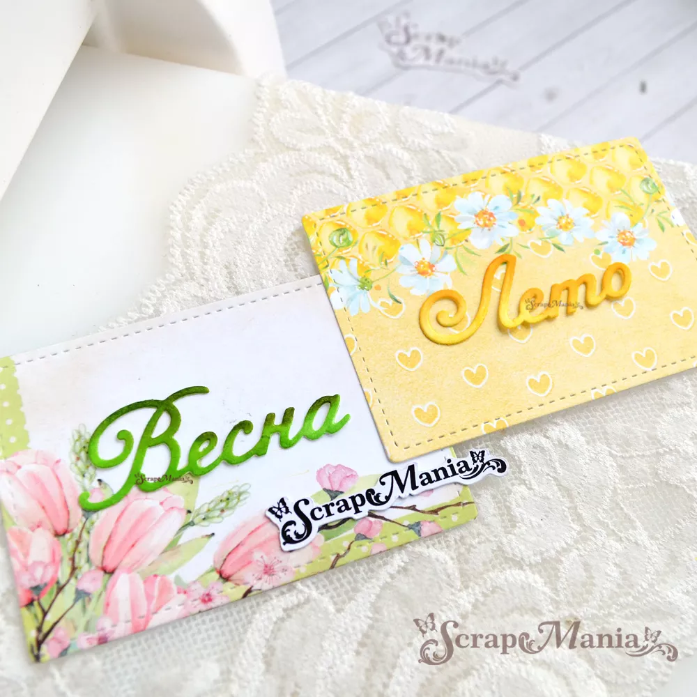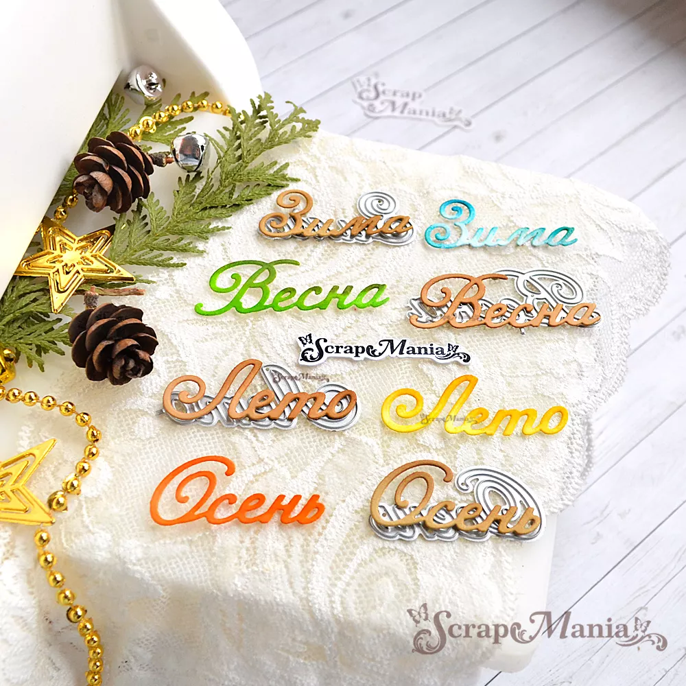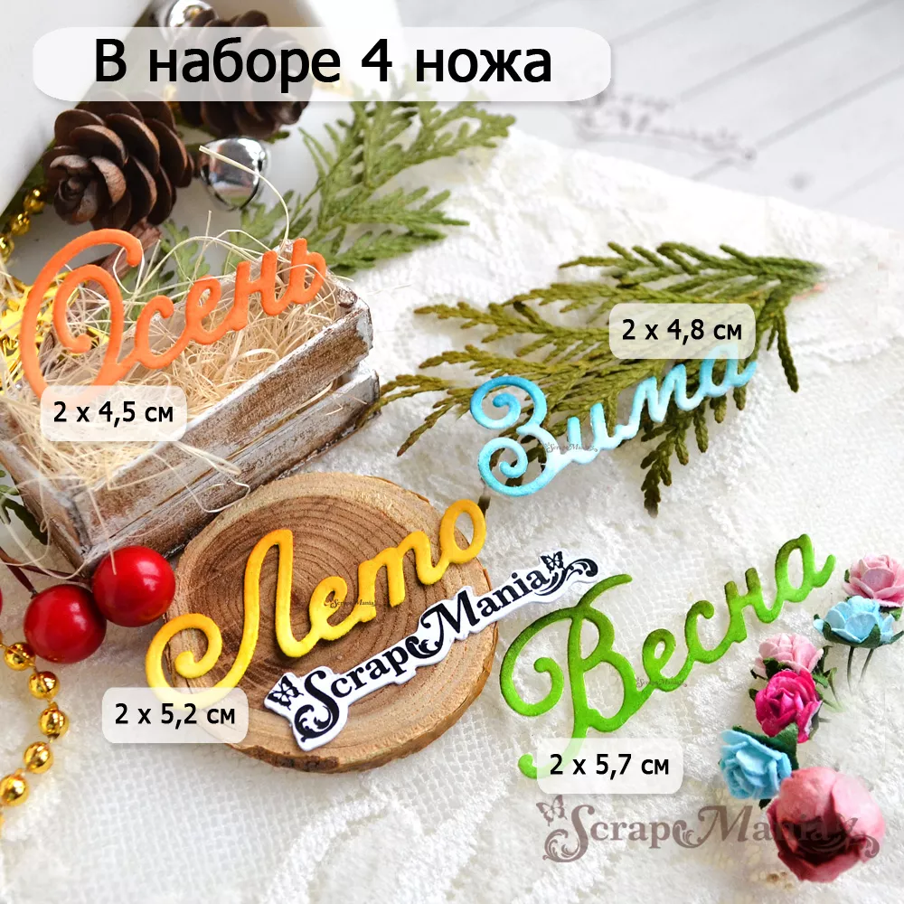 В наборе 4 ножа, соединенных перемычкой, которую при необходимости можно перекусить. Общий размер 5,4х9,7 см. Размер слова "Лето" - 2х5,2 см, "Зима" - 2х4,8 см, "Осень" - 2х4,5 см, "Весна" - 2х5,7 см. Прекрасно подойдет для создания надписей к страничкам, альбомам и открыткам