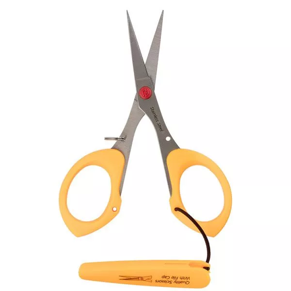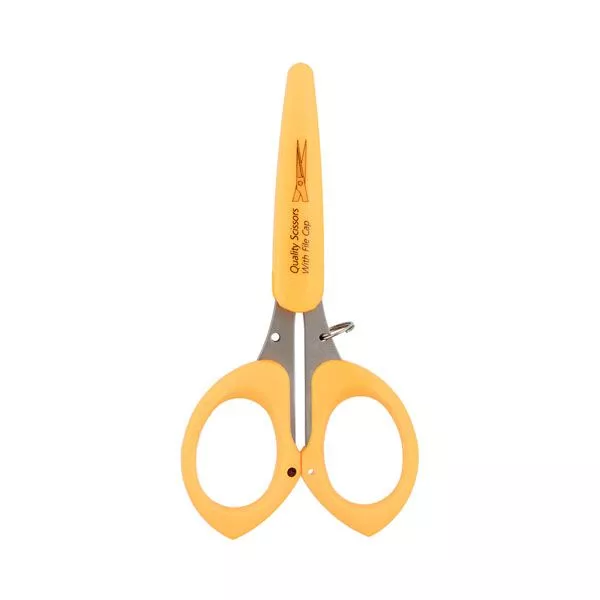 Металлические ножницы с пластиковыми легкими ручками и защитным колпачком. Цвет оранжевый. Длина ножниц 11,5 см , длина лезвия 3,8 см