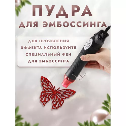 При запекании пудра создает полупрозрачное покрытие с блеском глиттера. Способ применения: нанесите клей для эмбоссинга на штамп или нарисуйте кистью на поверхности задуманный рисунок, затем нанесите пудру для эмбоссинга, пудра останется только там, где был нанесен клей, излишки пудры стряхните обратно в баночку. После этого, нагрейте полученный оттиск феном для горячего эмбоссинга, пока пудра полностью не расплавится.