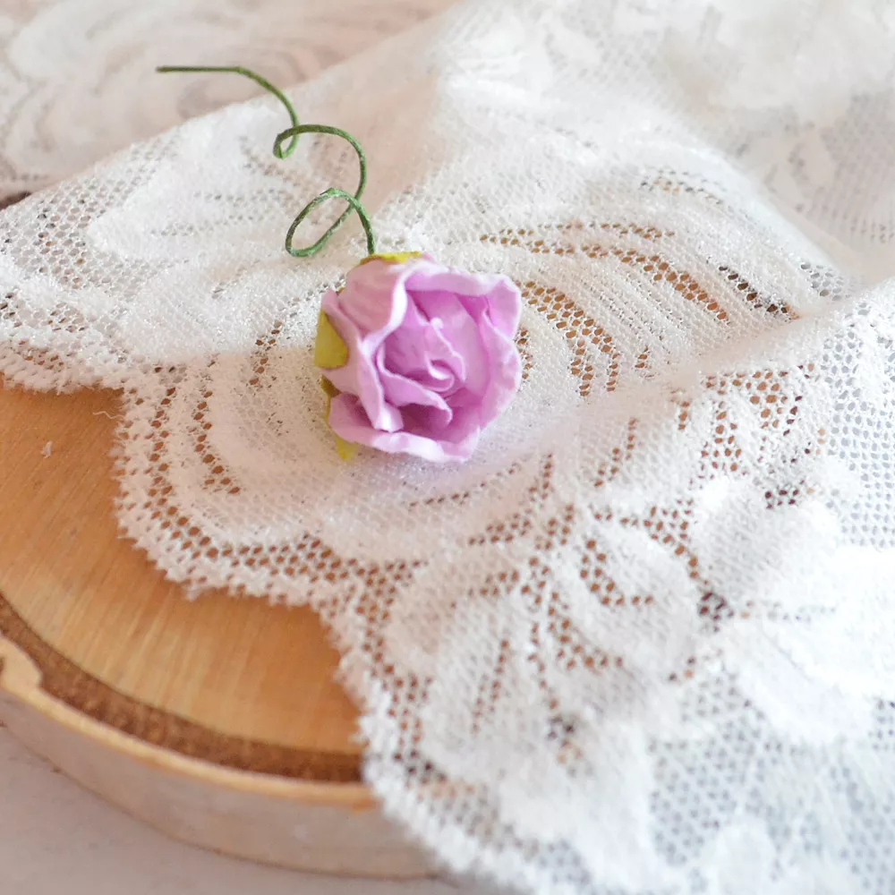Многослойный цветок розы на проволочной ножке. Лепестки с красивым легким тиснением и волнистым краем максимально повторяют форму живых цветов. Диаметр бутона 1,5 см, высота 2 см, длина ножки 8 см