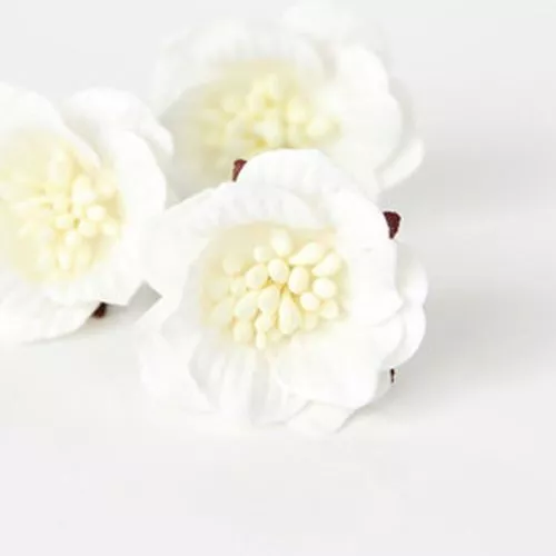 Многослойный цветок с украшенной сердцевинкой. Лепестки имеют волнистый край и нежное тиснение. Сердцевинка украшена россыпью красивых тычинок. Диаметр бутона 3 см, высота 1,5 см, длина ножки 2,3 см