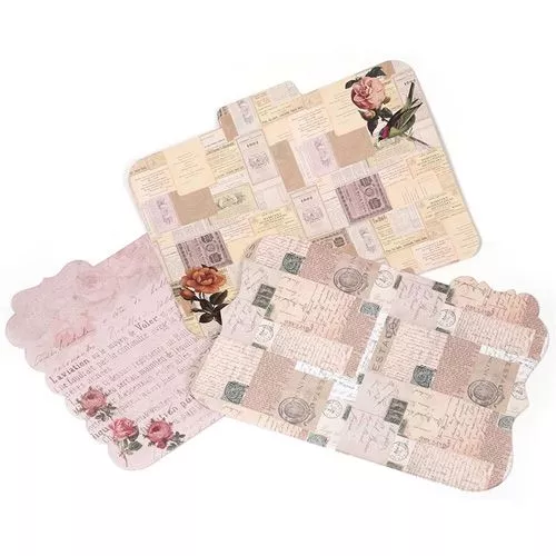 6 двусторонних разворотов 23х20 см (каждого по 2 дизайна) из плотной бумаги (около 180-200 гр/м2) с фигурными и скругленными краями. По бокам корешки для подписей